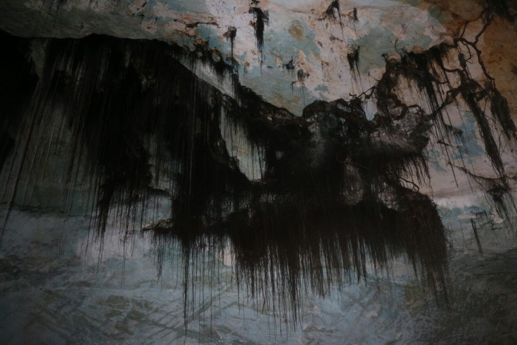 Faute d’éclairage adéquat, nous ne nous sommes pas risqués très loin dans ce labyrinthe souterrain. Nous avons tout de même pu constater la coloration bleuâtre de certaines parois, un souvenir de l’utilisation du sulfate de cuivre comme désinfectant, au temps où ces carrières étaient utilisées pour la culture des champignons de Paris (années 1970).