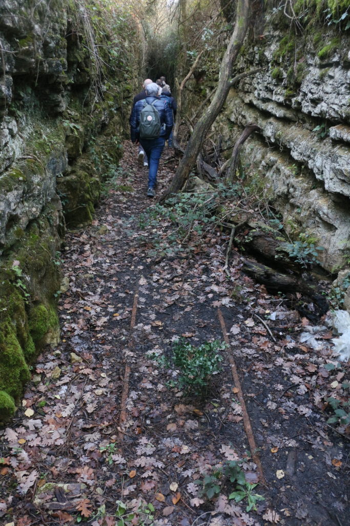 Nous avons d’abord visité le garage du petit locotracteur qui tirait naguère les wagonnets sur des voies étroites. Des voies qui menaient aux carrières, de l’autre côté de la colline, en empruntant une tranchée et un mini-tunnel aujourd’hui bien cachés dans les broussailles.