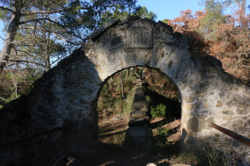 On découvre également un modeste bâtiment qui abritait le treuil du funiculaire, avec des poulies qui guidaient le câble retenant les wagons. En soulevant les taillis dans l’axe du treuil, nous avons entrevu les deux voies ferrées qui mènaient à la briqueterie, le long d’un plan incliné de 830 m de longueur.