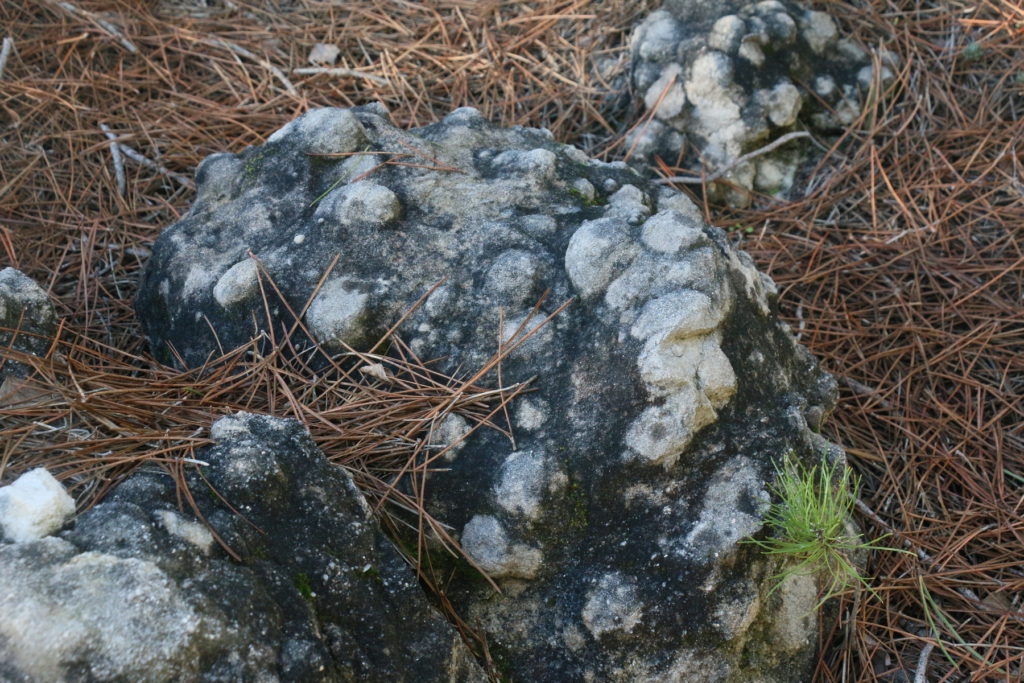 Une fois visitées ces ruines, direction le vallon de Noyères, d’où était extraite cette fameuse argile enrichie en alumine qui a fait la réputation des briques réfractaires de Bollène. Sur la crête de la colline, dans une ancienne carrière, nous avons pu admirer de nombreux nodules de grès blancs encore prisonniers de la roche ou détachés par l’érosion.