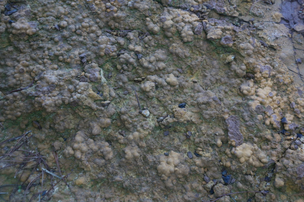 Après quelques minutes de marche, nous avons rejoint la dernière carrière d’argile encore en exploitation aujourd’hui. En hiver, la pluie remplit d’eau l’excavation et forme un lac temporaire qui cache une couche d’argile jaune orangé. En descendant les pentes raides, nous avons pu admirer les étonnantes couleurs des sables ocreux, ainsi qu’une couche de pisolithe (croûte de carbonate de calcium à petits nodules).