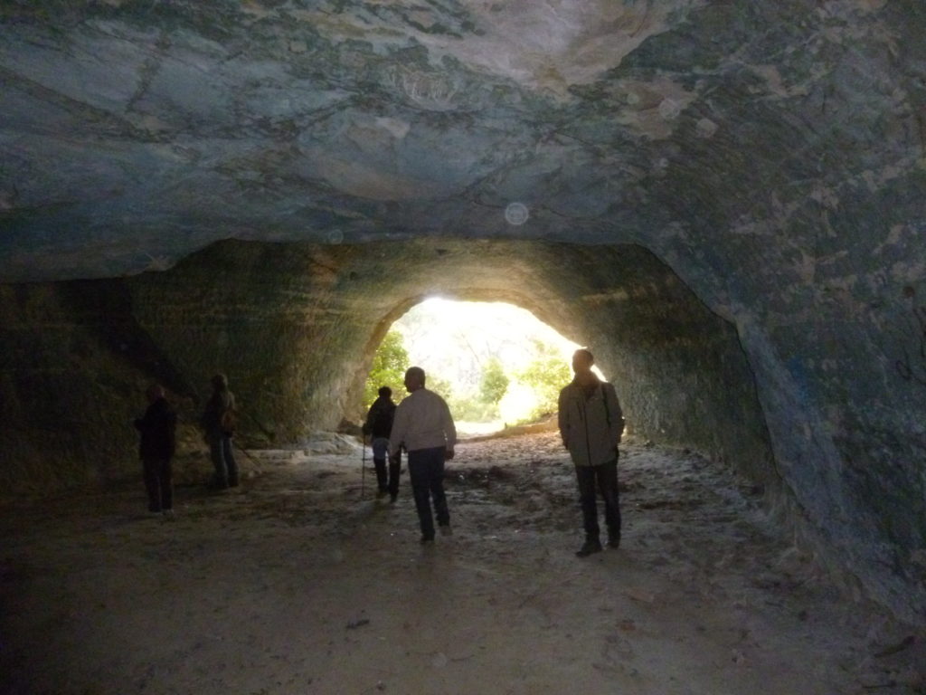 Comme prévu dans le programme, notre petit groupe s’est retrouvé au sud de la vieille ville, sur la colline de Jonqueirolles. Et dès la descente de voiture, nous avons été confrontés à de vastes et mystérieuses cavernes. Ces ouvertures en forme de trapèze ont, en fait, été taillées par des humains à coups de pic. Ce sont d’anciennes carrières de pierres de taille et de sable, creusées en galeries dans le grès turonien du sommet de la colline.